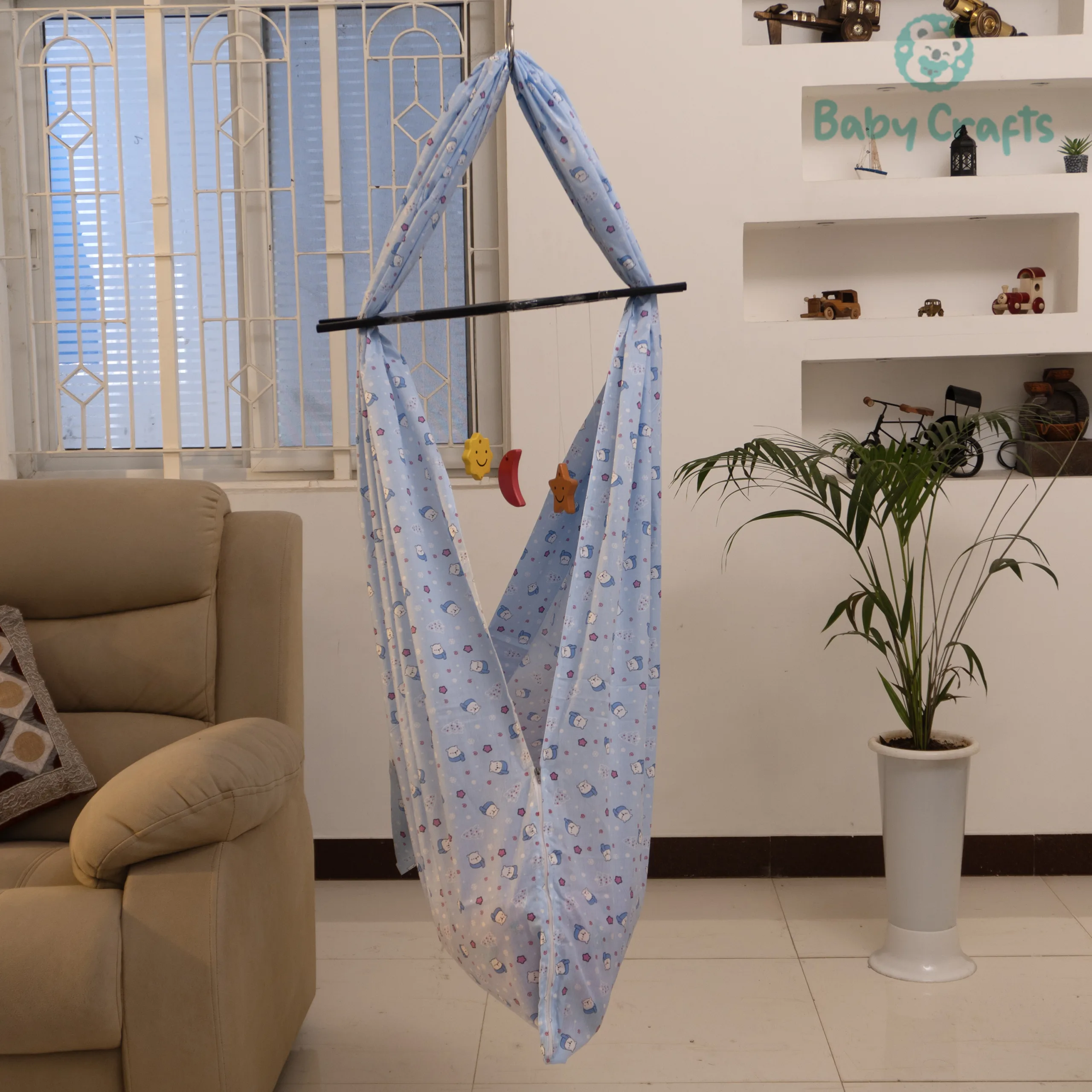 Lovingly crafted for comfort and safety, our Cotton Baby Cradle features breathable cotton fabric and a secure zip closure to keep your baby snug and safe. Gentle sway, cozy design – perfect for sweet dreams.